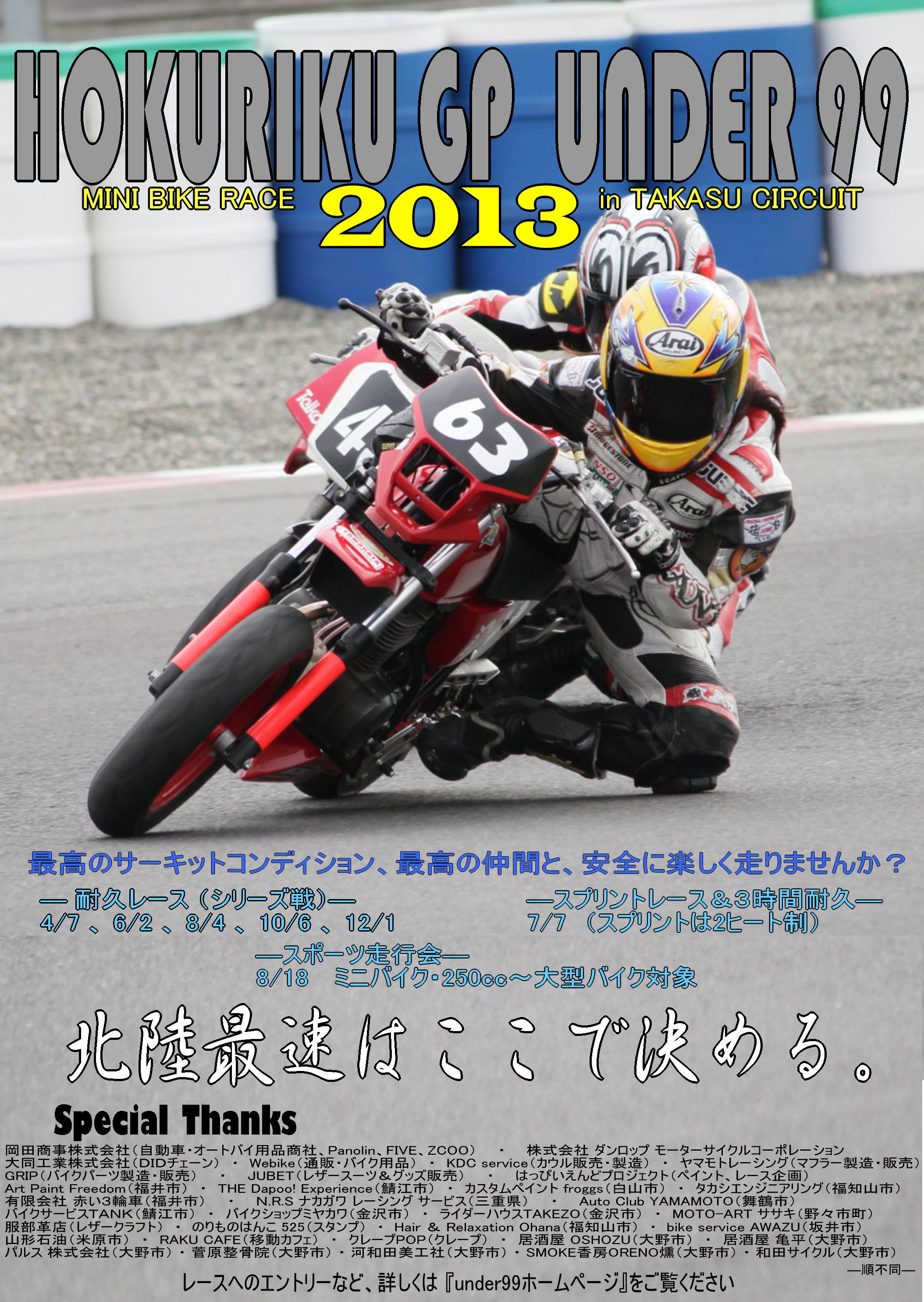 2013年もunder99はイベント(レース・走行会などの活動)を通じて青少年の育成、バイクの素晴らしさ・楽しさ・安全運転の必要性を発信しております。