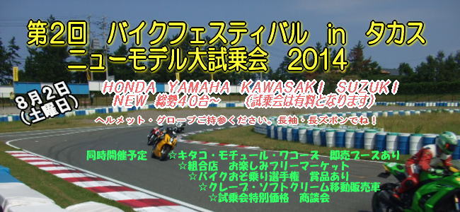 8月2日(土曜日) AM9:00より タカスサーキットにて大試乗会を開催します。各メーカー新型試乗車 総勢40台以上持っていきます。この機会に是非新型の素晴らしさ・乗りやすさを体験してみてください。なかなかこんなに一気に乗れるチャンスはありません。但し一車種ワンコインだけ応援お願いいたします。