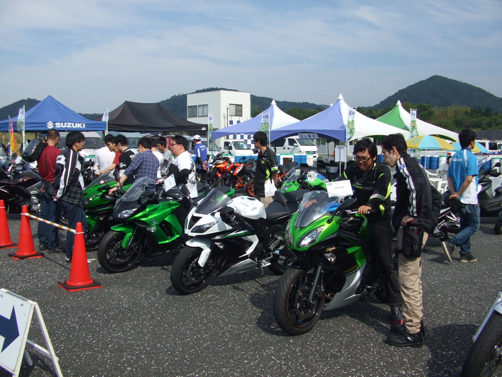 試乗受付は午前8:30より午前の部の受付をします。午後の部の関しては午前11:30より受付させていただきます。その際には免許証のご提出をお願いします。長袖長ズボン等、バイクに乗れる服装でお越しください。