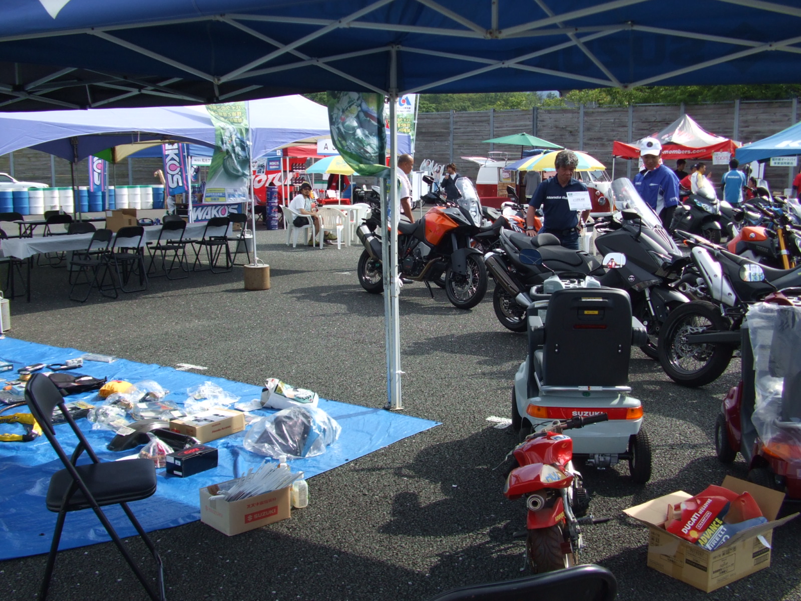 別のテントでは掘り出し物があるかも!フリーマーケットや、ヤマハ電動自転車・スズキ電動セニアカーの試乗コーナー、オイル・工具・用品メーカーなどが出店します。