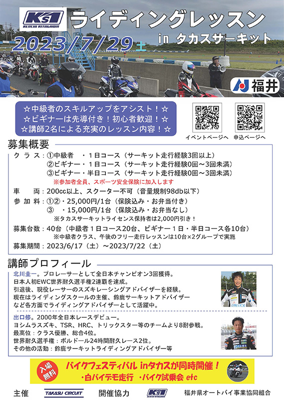 ライディングレッスンinタカスサーキット 2023年7月29日開催!